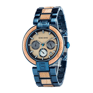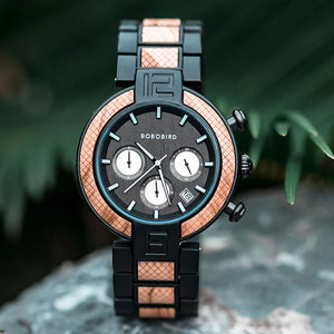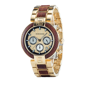 The Elegant Wooden and Steel Wristwatch for Men features a luxurious stainless steel band with a bracelet clasp, measuring 24 cm in length and 20 mm in width. The watch has a 45 mm round stainless steel case with a thickness of 12 mm and is water-resistant up to 3 bar. It operates on a precise quartz movement and is protected by a durable Hardlex dial window. The watch comes in a wooden box, reflecting its sophisticated style.