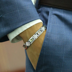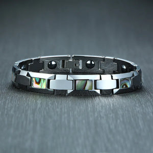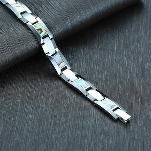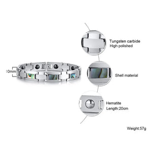 This men's tungsten bracelet combines the robust strength of tungsten metal with a sleek geometric design. The chain and link style provides a classic yet modern look, secured with a convenient pearl-clasp. Compatible with all devices, it also features a built-in fitness tracker, making it a perfect blend of fashion and functionality. The bracelet measures 20 cm in length, ideal for a comfortable fit.