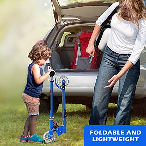 Folding Kick Scooter for Kids: two deluxe aluminum flash wheels, rear fender brake, and adjustable height. Perfect for both girls and boys!” 🛴